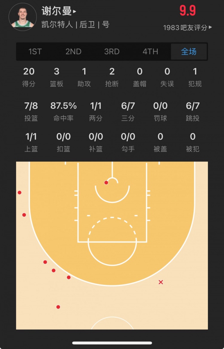 凱爾特人30號(hào)秀 貝勒-謝爾曼 登場(chǎng)15.9分鐘
