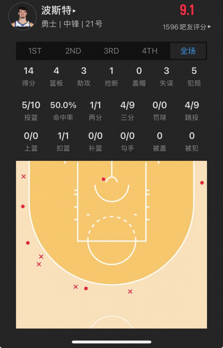 勇士52號(hào)秀 昆滕-波斯特 登場(chǎng)23.1分鐘